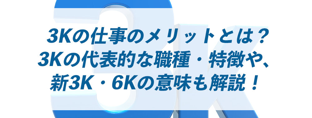 1990年ごろに流行語として登場した「3K」とは、「きつい(Kitsui)」「汚い(Kitanai)」「危険(Kiken)」の3つの頭文字を取った言葉で、主に現場で働くブルーカラーの職種が多く該当します。以来、3Kは「労働条件の厳しい仕事」を指す労働用語として一般化し、これら3つの条件に当てはまる仕事は、3労働・3K職種とも呼ばれるようになりました。