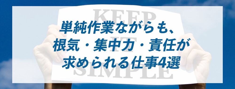 黙々と決められたルールに則って単純作業をこなすには高い集中力が求められますし、同じ作業を繰り返すための根気や我慢強さが求められます。さらに、決められた時間のなかで与えられた業務をきちんと完遂するには時間配分や手間の創意工夫が求められます。こうした点から、決して誰でもできる、頭を使わない簡単な仕事ではないといえます。