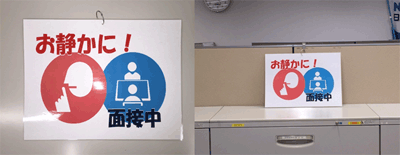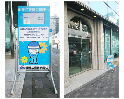 面接実施中は事務所内にその旨の案内板を設置し、社員一同、皆様に不快な思いをさせることの無いよう心がけます。