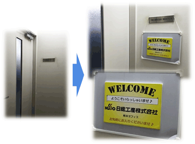 冷暖房や周りの音の問題もあるので、ドアを解放しておく訳にはいかないのですが、皆様が分かり易くかつ、来所していただきやすいようにウェルカムプレートを設置いたしました。