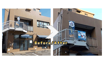 写真の通り社名のガラスサイン(カッティングシート)はあったのですが、立地的に来場者は正面ではなく建物の左右から来られるため視認しづらい状況にありました。ご来場の際、どこからでも認識できるよう入り口階段の立体的な部分に垂れ幕を設置しました。