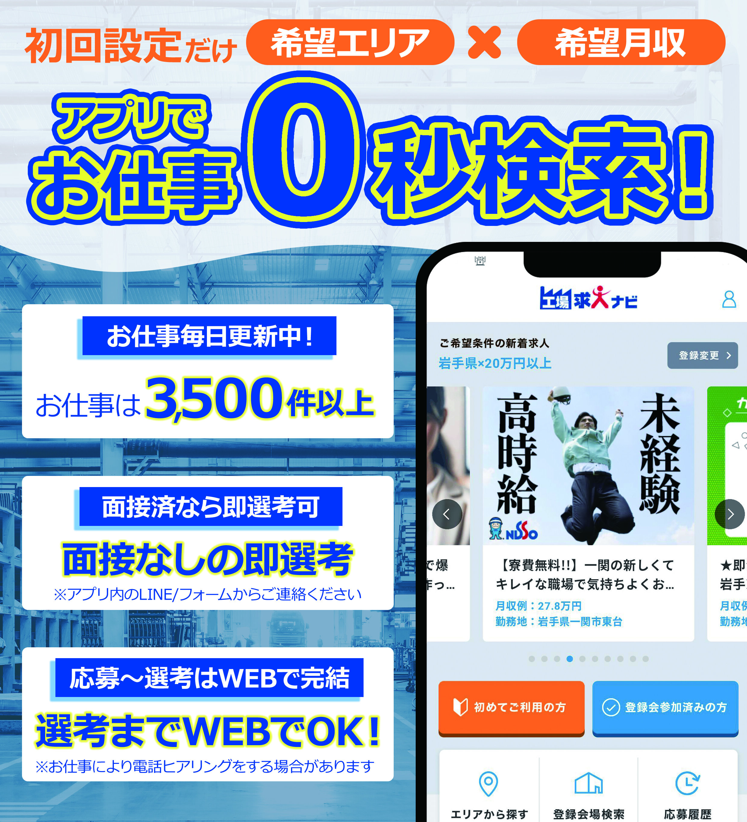 いつも「工場求人ナビ」をご利用いただき、誠にありがとうございます。 この度、「工場求人ナビ」のサービスをより便利にご利用いただくため、 公式スマートフォンアプリをリリースいたしました。 アプリでは、ウェブサイトと同じ機能をよりスムーズに、 快適にご利用いただけます。 ぜひこの機会にダウンロードいただき、お仕事探しにご活用ください。
