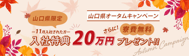 山口県にあるお仕事(下記のお仕事No)に11月中に入社された方に入社特典20万円を支給します!