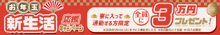 1月入社で1/13(火)までに赴任・入寮した方に現金30,000円を進呈いたします。
