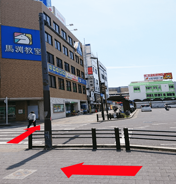 「馬淵教室」前で左に曲がり、横断歩道を渡ります