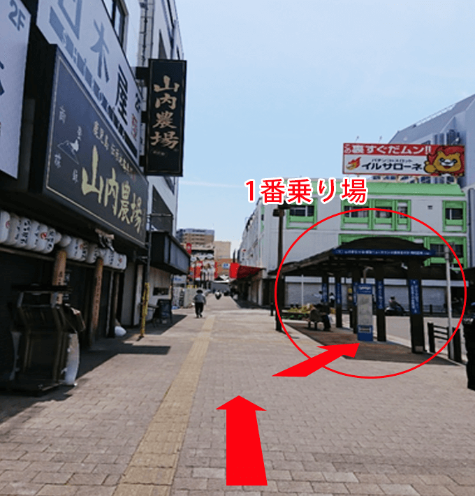 横断歩道を渡ったら、直進し、右手にある「1番乗り場」からバスに乗車します