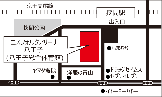 「東京都八王子市狭間町1453-1 エスフォルタアリーナ八王子」を目指してお越しください。