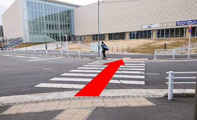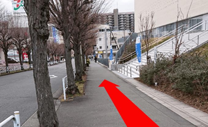 「エスフォルタアリーナ八王子(面接会場)」横の歩道を下り方向に前に進みます