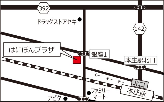 「埼玉県本庄市銀座1丁目1番1号 はにぽんプラザ」を目指して来てください。