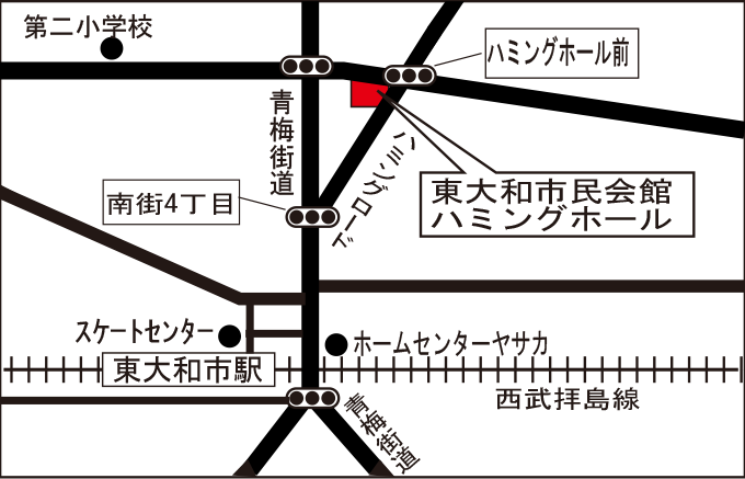 「東京都東大和市向原6丁目1 東大和市民会館ハミングホール」を目指してお越しください。