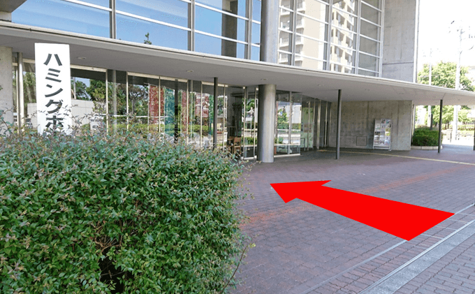 右側「ハミングロード」に沿った歩道を進むと、「東大和市民会館ハミングホール(面接会場)」が歩道左側に見えてきます
