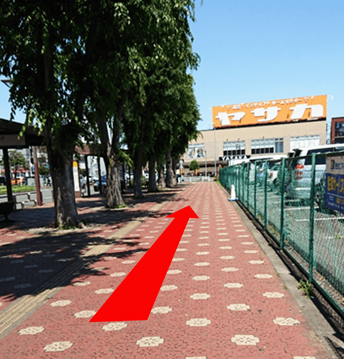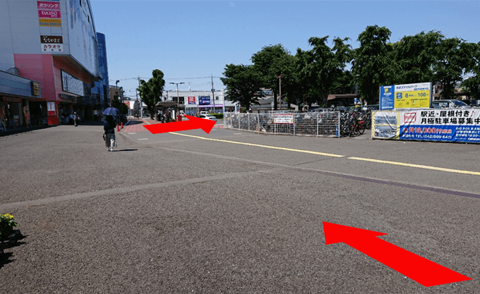 バスロータリーと駐輪場・駐車場の間の歩道をまっすぐ進みます