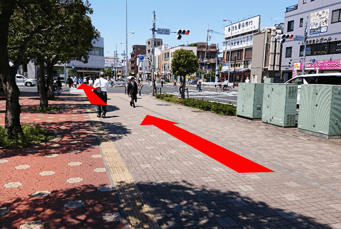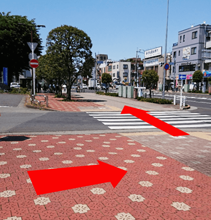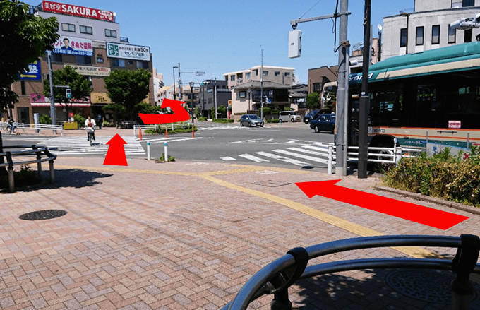 歩道の終わる地点とバスロータリー入口が交わるところにある横断歩道を左手に渡り、前方スクランブル交差点まで進みます