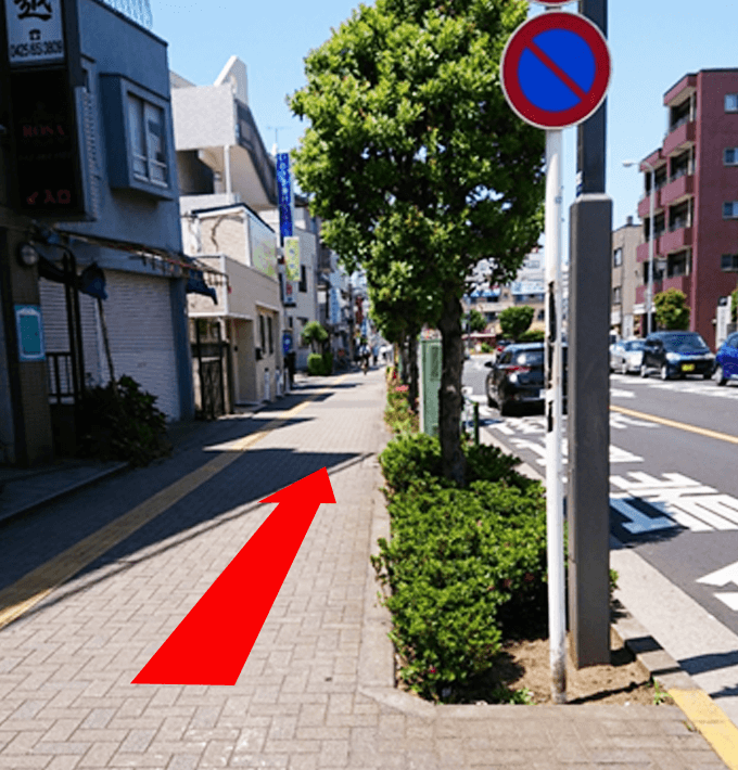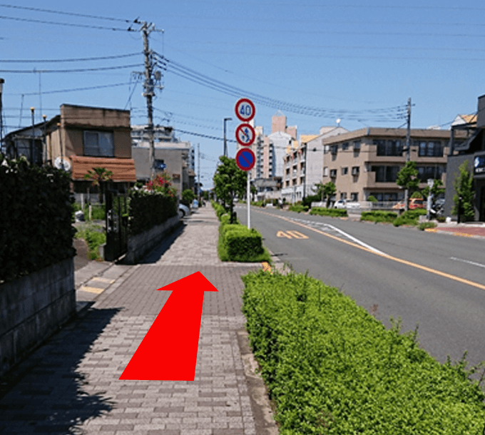 交差点を渡り、左側建物沿い歩道をまっすぐ進みます