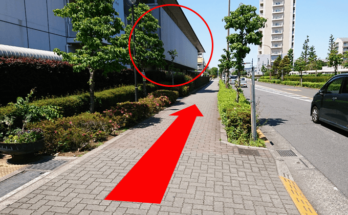 信号を渡り、前方建物を右側へ建物沿いの歩道をまっすぐに進みます。