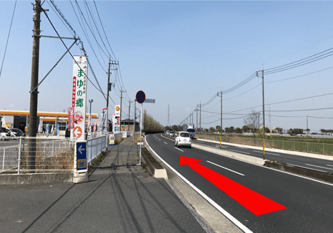 左手に「まゆの郷」という看板や、ミニストップがある交差点があります。