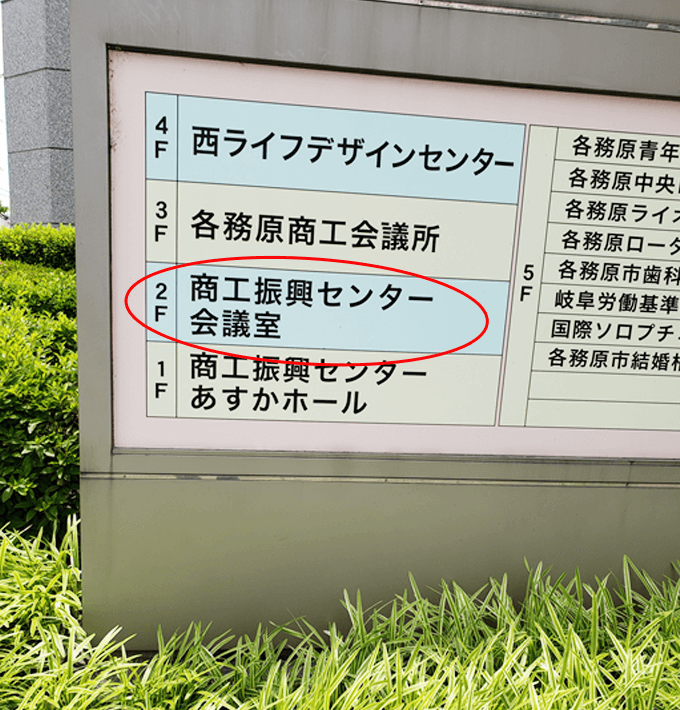 建物の前の案内盤に、「2F 商工振興センター会議室」と書かれています