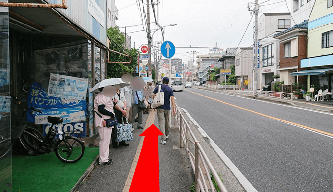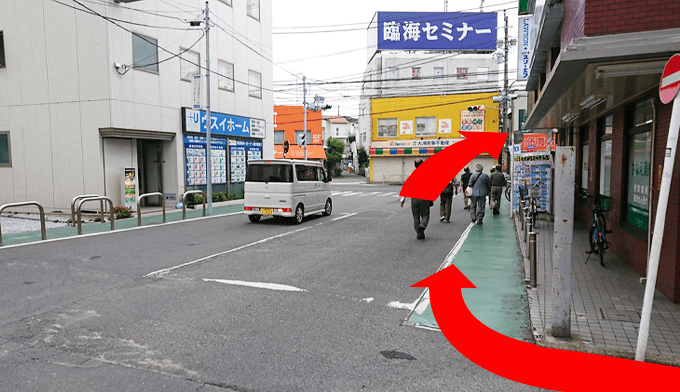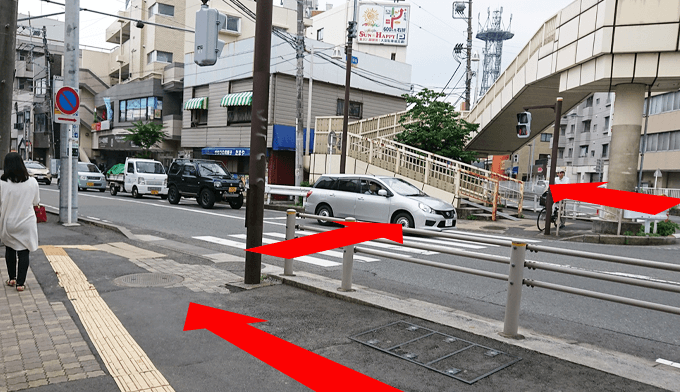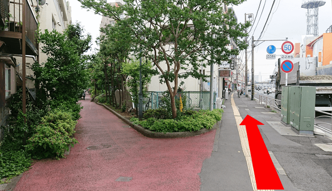 交差点の横断歩道を渡り、歩道をそのまま進みます