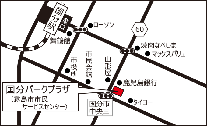 「鹿児島県霧島市国分中央3丁目9-20 国分プラザパーク」を目指してください。