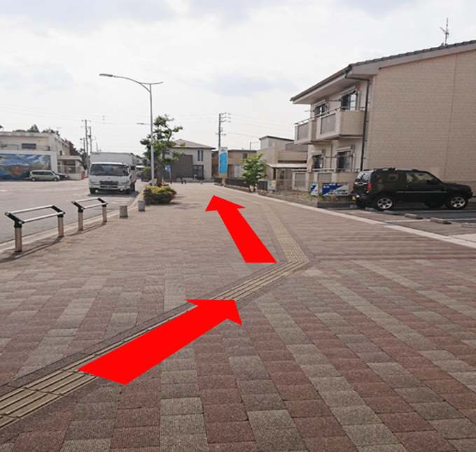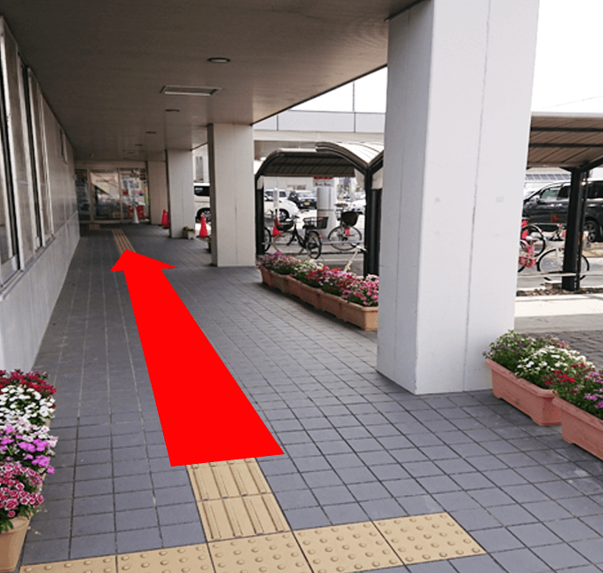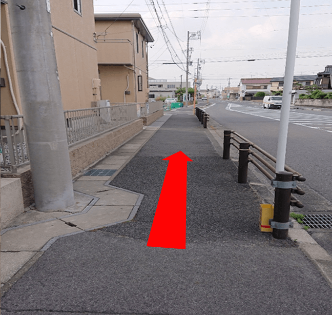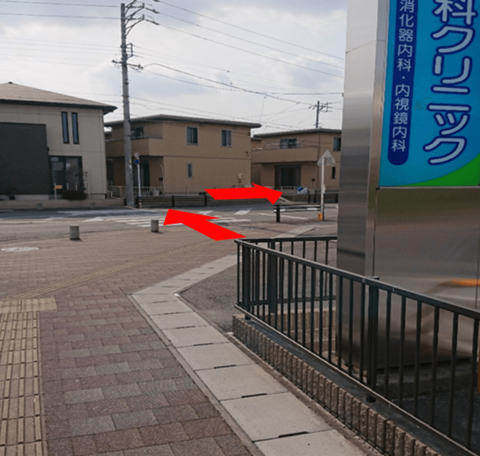 「おおやま内科クリニック」前にある横断歩道を渡り、右に曲がり、直進します