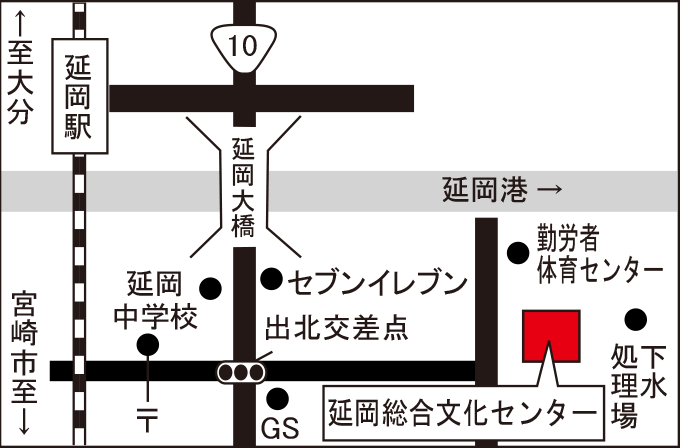 正面左に茶色い建物が見えてきます。そこが「延岡総合文化センター(面接会場)」となります