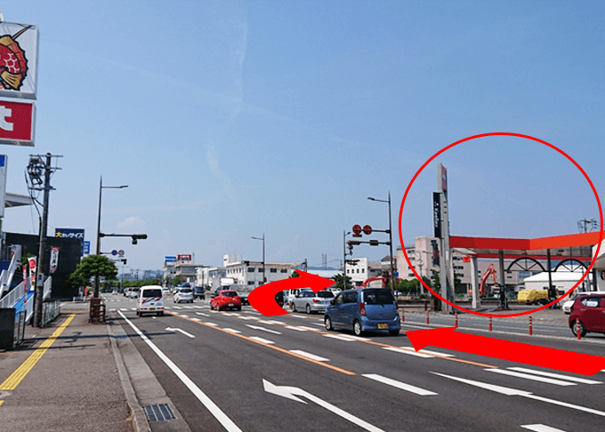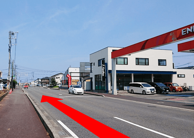 国道10号線を北上し、出北交差点を右折します。「ENEOS」が目印です。