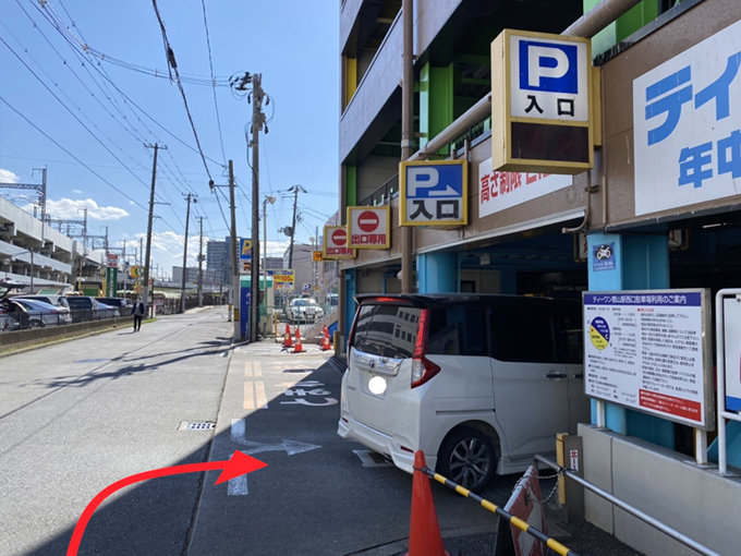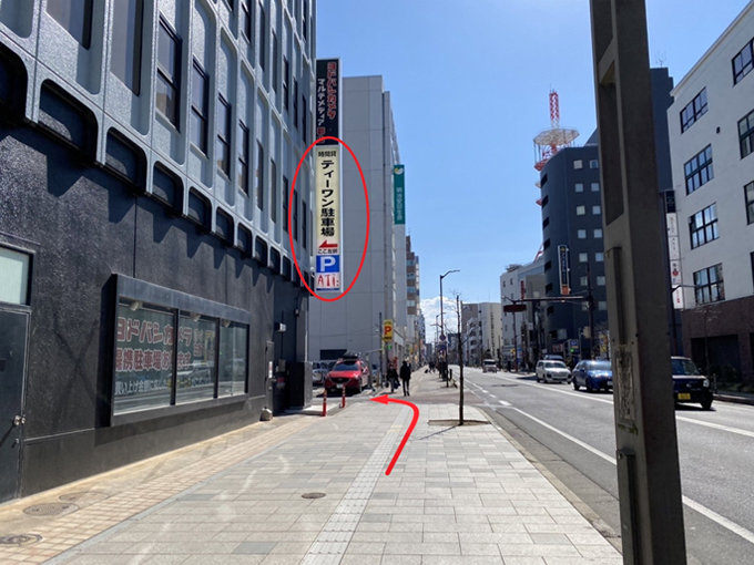 西口ロータリーを左に曲がり、ヨドバシカメラの建物を左手に進むと、「ティーワン駐車場」の看板があります。