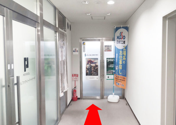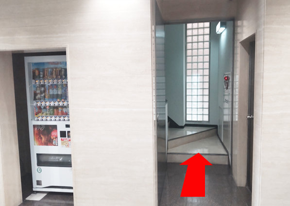 自動販売機の横に階段、その奥にエレベーターがありますので2階まで上がります