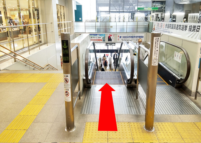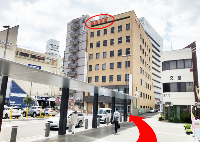 エスカレーターを降りたら、すぐ右に曲がり、駅前ロータリーに沿って進みます。