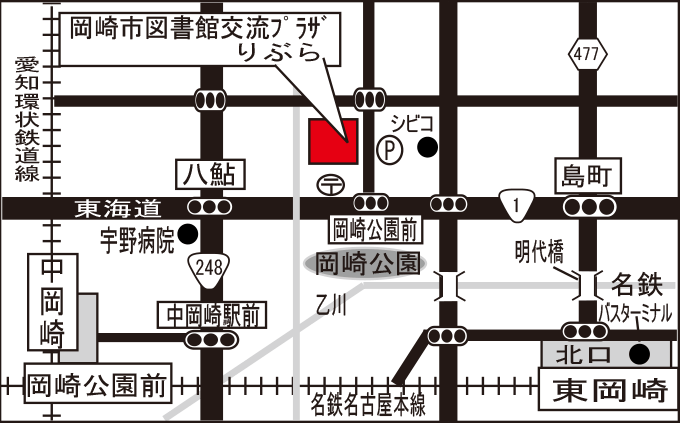 「岡崎市康生通西4丁目71番地 岡崎市図書館交流プラザりぶら」を目指して来てください。
