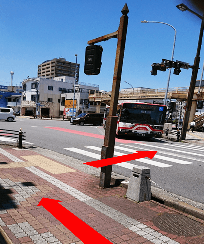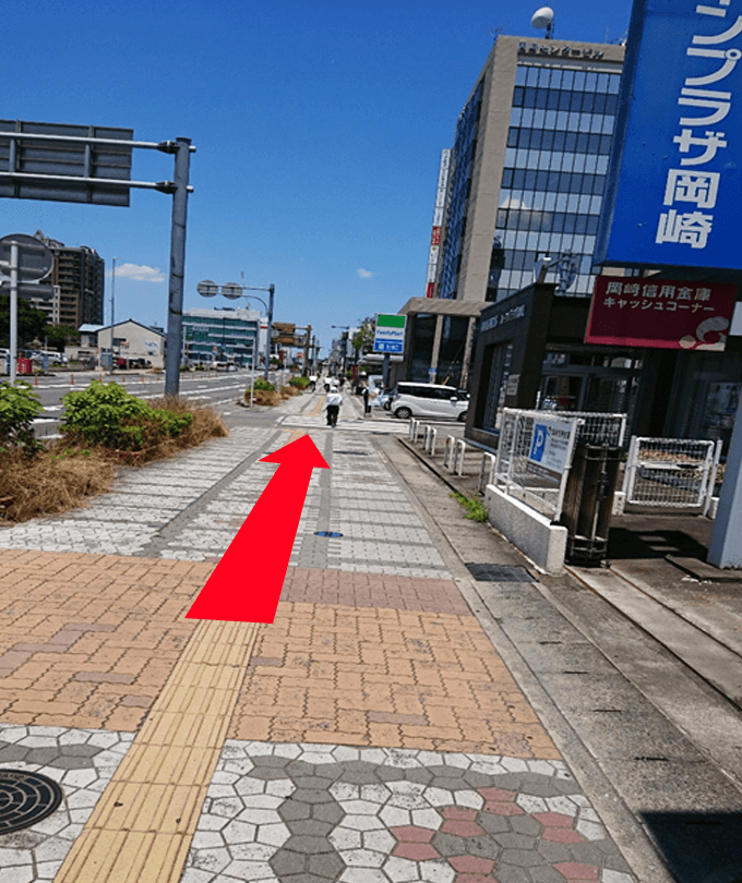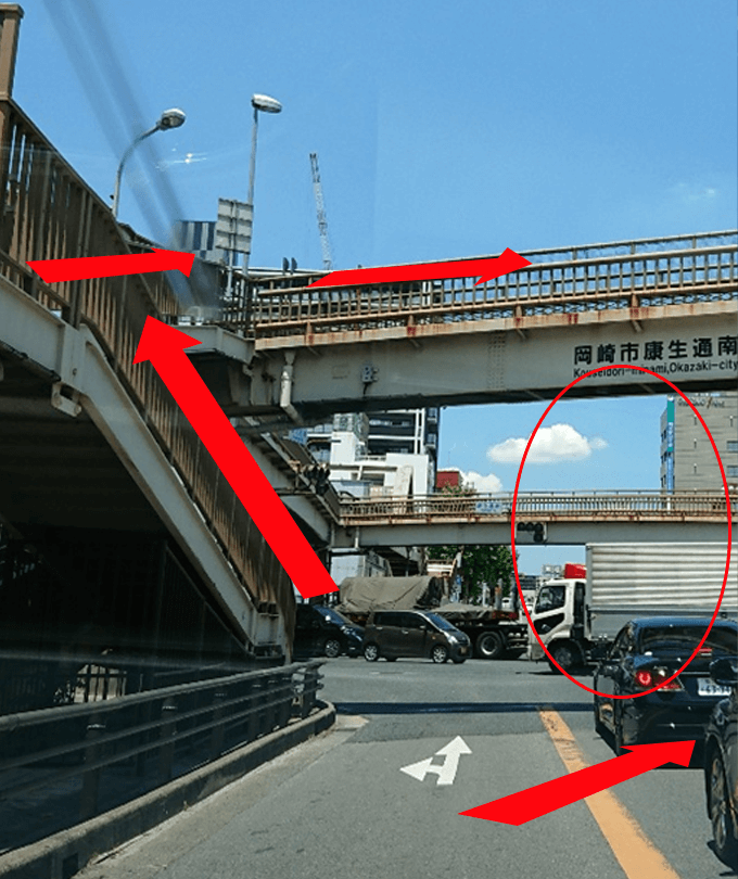 しばらく歩くと「岡崎市康生通南」と書かれた歩道橋がありますので、そこを上って道路を渡り、そのまま直進します