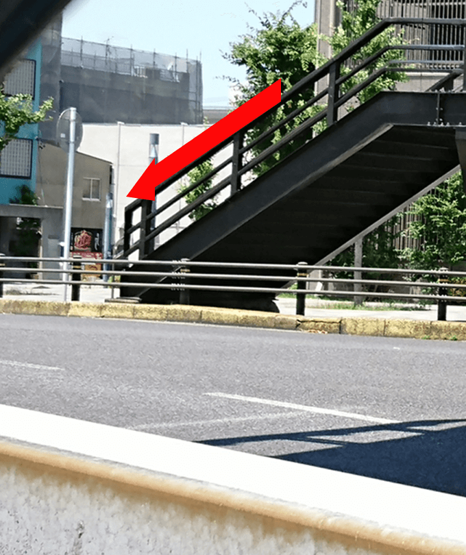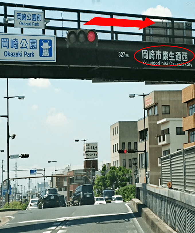 しばらく歩くと「岡崎市康生通西」と書かれた歩道橋がありますので、そこを上って反対側に渡ります