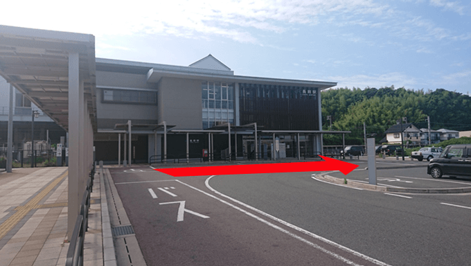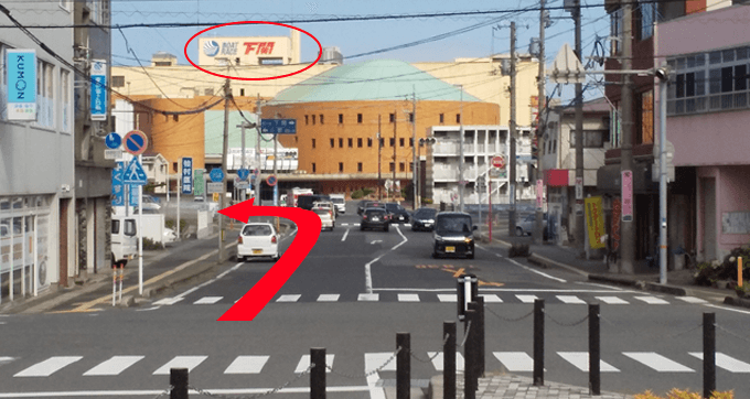 ロータリーに沿って歩き、駅を出て正面に見える「ボートレース下関」前の交差点を目指します