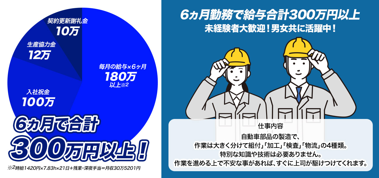 | 給与 | 月収例305,201円 ※月収内訳 時給1,420円×7.83h×21日 |