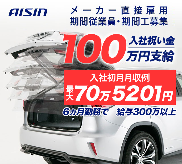 | 【株式会社アイシン】 自動車関連製品の生産に携わる各種作業(加工・組付・検査・物流) 加工:部品を機会にセットしスイッチを押す 組付:加工にてできた部品の組付け、組立て 検査:各工程での完成品の検査 物流:工程間の部品の運搬、完成品の回収 ※作業内容は勤務工場や担当ラインにより異なります。 |