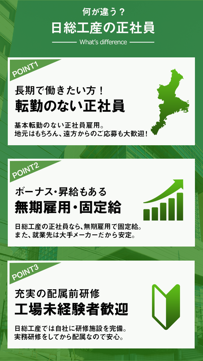 ※入社より3か月間は試用期間となります。 ※メーカーへの正社員転籍制度あり |