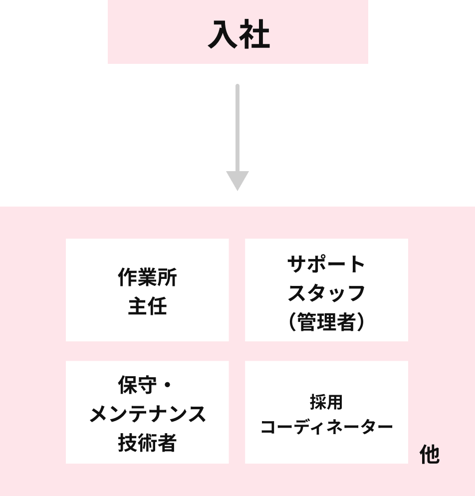 派遣契約スタッフ・職種限定の正社員で経験を積み、「キャリアパス制度」で作業所主任、サポートスタッフ、保守・メンテナンス技術者などへのキャリアチェンジも可能です。