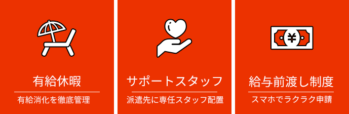 | 福利厚生 | ・各種社会保険完備(健康/雇用/労災/厚生年金) ・有給休暇 ・各種手当(時間外残業・深夜・休日) ・赴任旅費 ・ホットライン(職場相談) ・各種割引が利用できる福利厚生パッケージサービス ・キャリア相談 ・各種教育制度 ※各種規定有 |