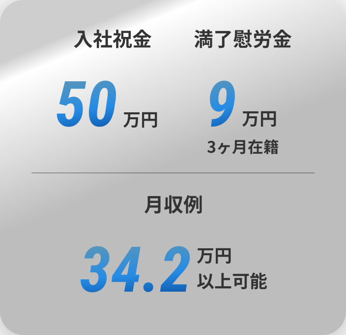 満了慰労金 9万/3ヵ月在籍(初回契約時は3万)で支給。 皆勤手当 2か月ごとに8万円(初回1カ月4万)