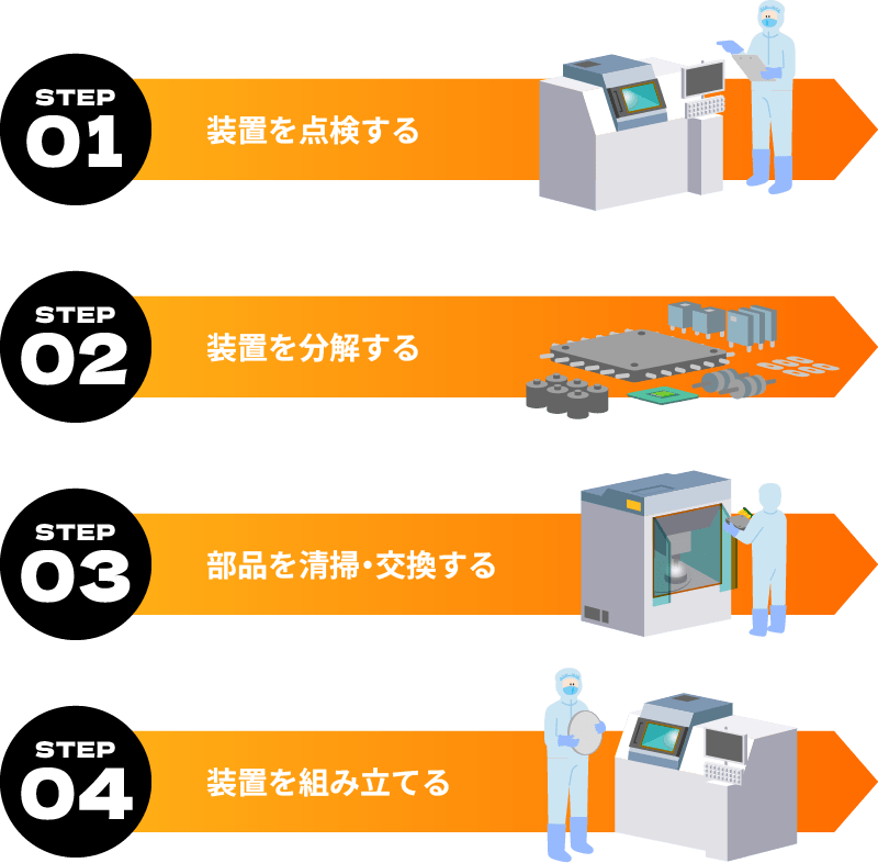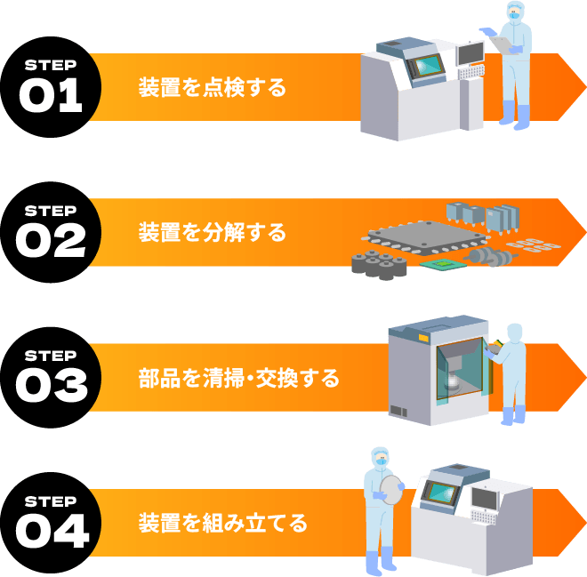 半導体装置のメンテナンス業務 ドライバー等工具を使用して装置を分解し、 部品を洗浄します。その後、再び装置を組み立てます。 クリーンルーム内での作業となります。 |