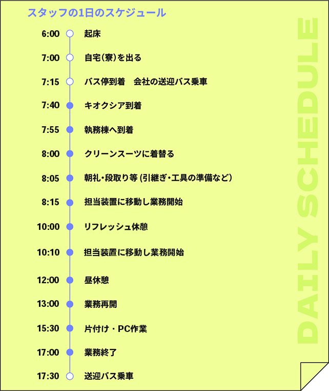 ・各種社会保険完備 (健康/雇用/労災/厚生年金) ・賞与年2回(6月/12月) ・昇給年1回(4月) ・退職金 ・有給休暇 ・慶弔見舞金 ・各種手当 (作業等級・時間外残業・深夜・休日) ・赴任旅費 ・ホットライン(職場相談) ・日総グループ福利厚生 (各種割引などのサービス) ・キャリア相談 ・各種教育制度 |