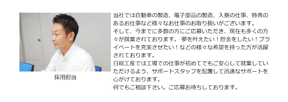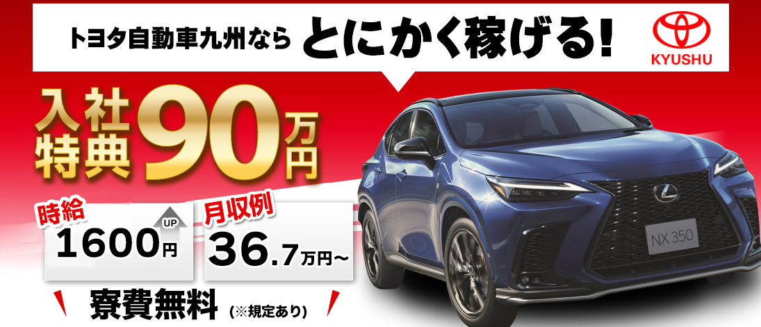 | 仕事内容 | ・トヨタ自動車九州株式会社 レクサス車の製造に係る各作業 ・本社宮田工場 |