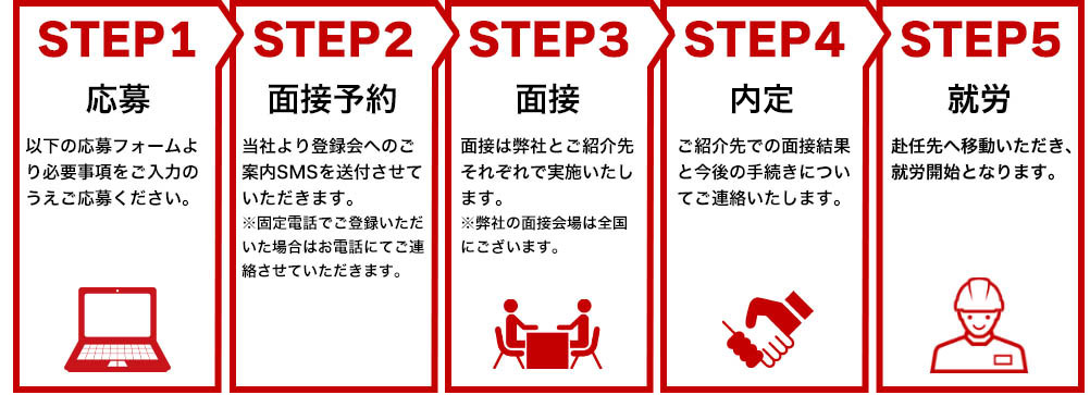 まずは全国の当社オフィスまたは特設会場にて面接を行い、その後、メーカー選考会に参加いただきます。日総工産のオフィス・特設会場を事前にご確認されたい場合は、0120-717-450までお電話いただき、オペレーターにご質問ください。