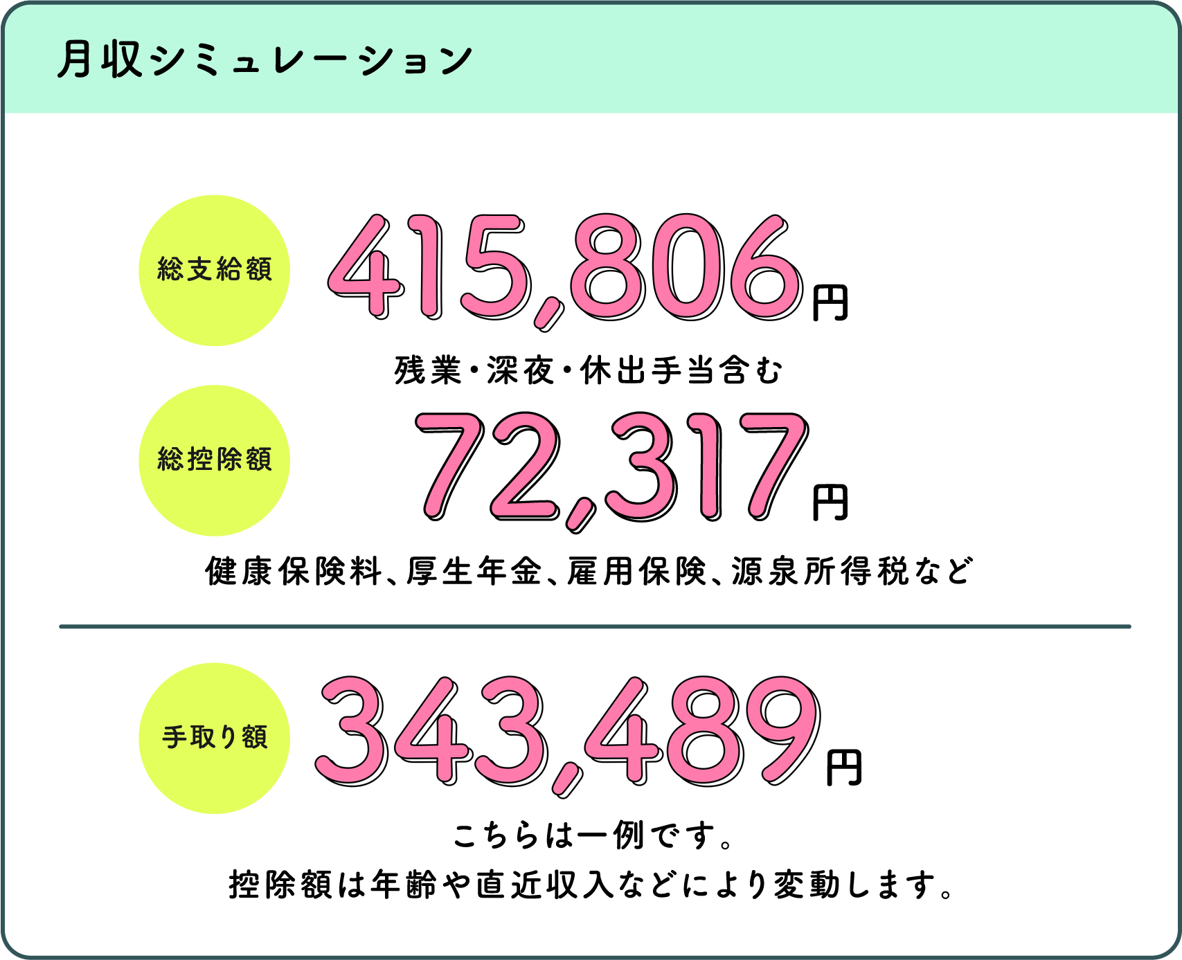 月収目安415,806円 (月給300,000円+残業手当+深夜手当+休日手当)