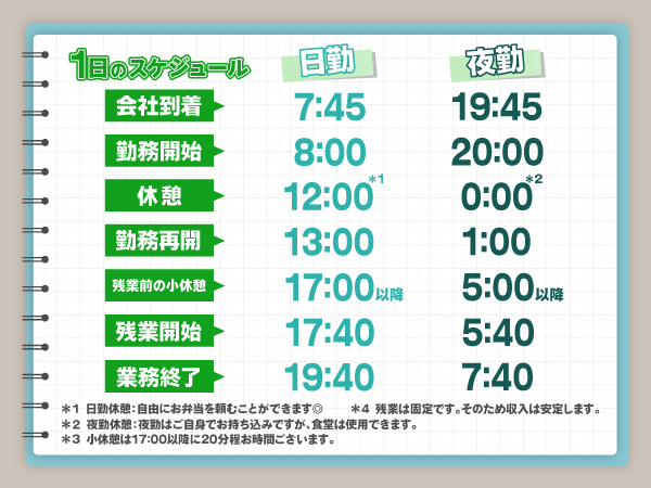 - ①08:00~17:40、②20:00~05:40