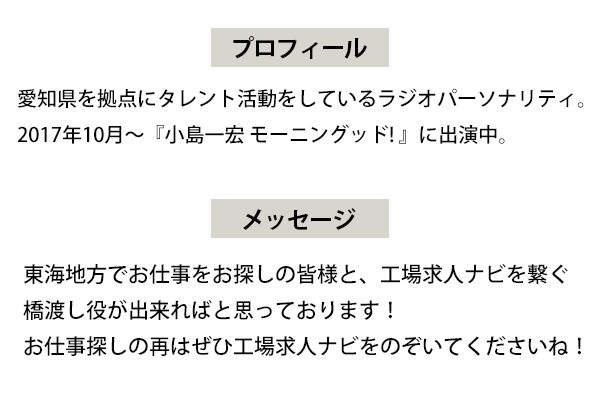 また、愛知県には通勤のお仕事を中心に、たくさんの高待遇のお仕事があり、東海地方内にお住まいの皆様に日総工産の愛知県のお仕事をより知っていただこうと、愛知県を拠点にタレント活動をしているラジオパーソナリティ「森由貴子さん」にプロモーションを担当いただいています。