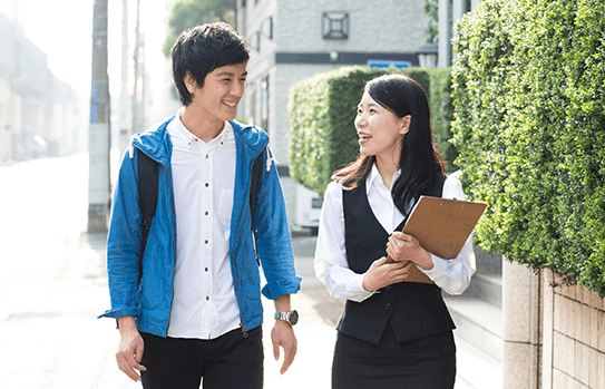待ち合わせてから一緒に向かいます。(入寮の方は寮にお迎えに行く場合が多いです。)