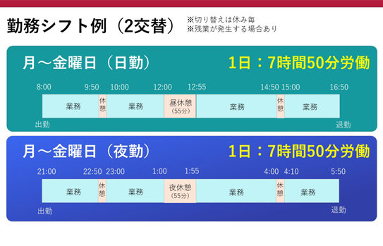 アイシン期間工の所定労働時間は1日7.83時間(7時間35分)、勤務体系は基本的に夜勤・昼勤を繰り返す2交替制勤務となります。