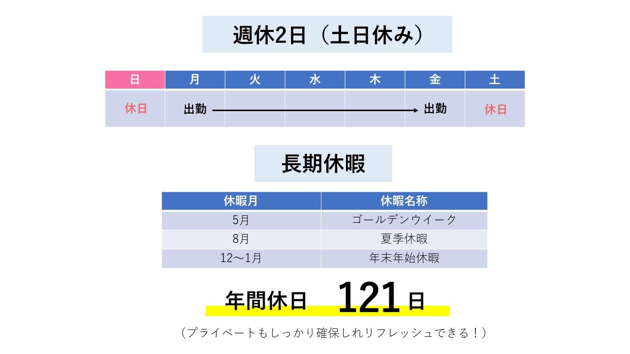 アイシンの工場では5勤2休(土日以外)を採用し、ゴールデンウィーク・夏季(お盆)・年末年始と年3回の長期休暇も充実。年間休日が121日と多めですので、プライベートやリフレッシュの時間もしっかり確保できるでしょう。