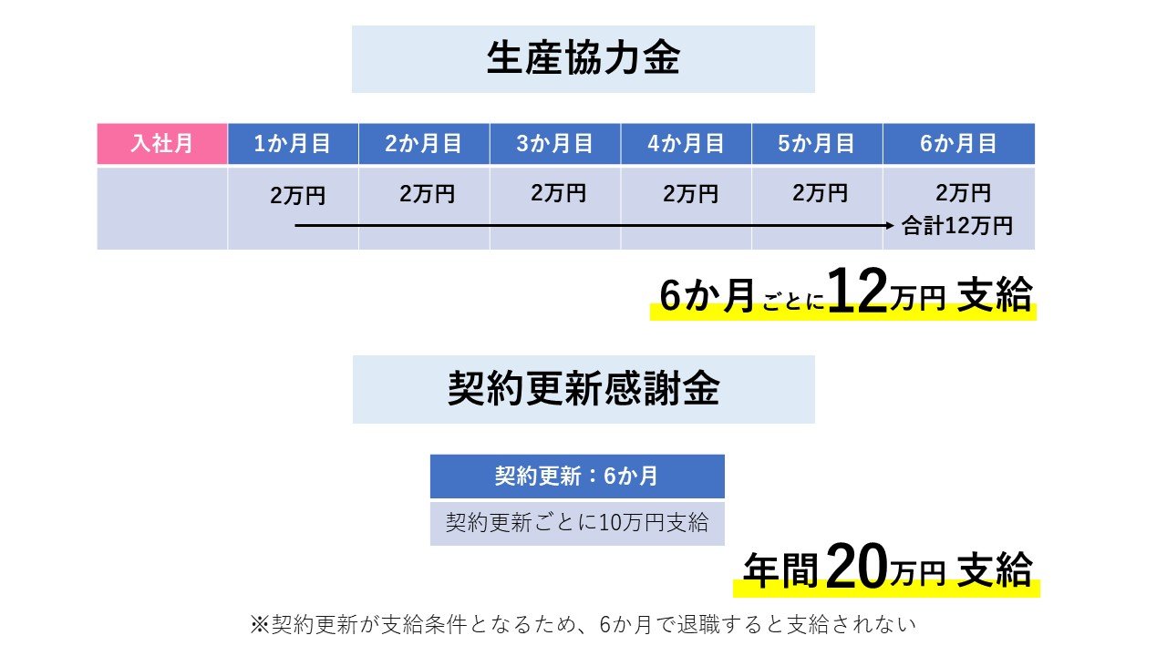生産協力金は1ヵ月あたり2万円で、支給のタイミングは契約満了月の給料と合わせて一括支給(6ヵ月ごとに12万円)されます。